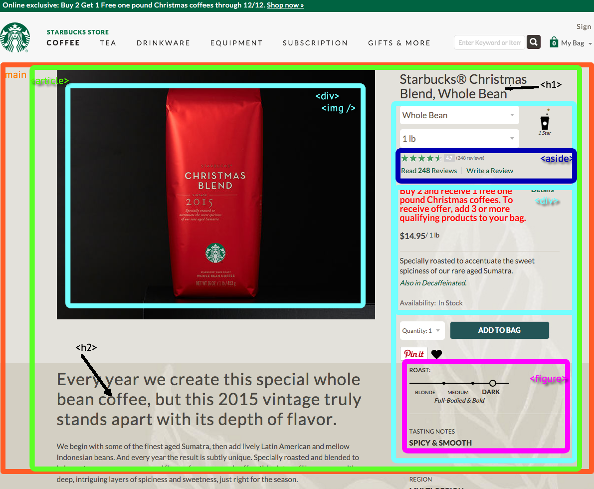 In fact, most “interior pages” on a site, such as this Starbucks page will be best served by wrapping their banner image and title in a <header> for a <section>