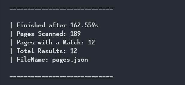 The ending console message showing how long the process took, how many pages were scanned, how many pages have a match, and total results. It also shows the name of the file containing the results.