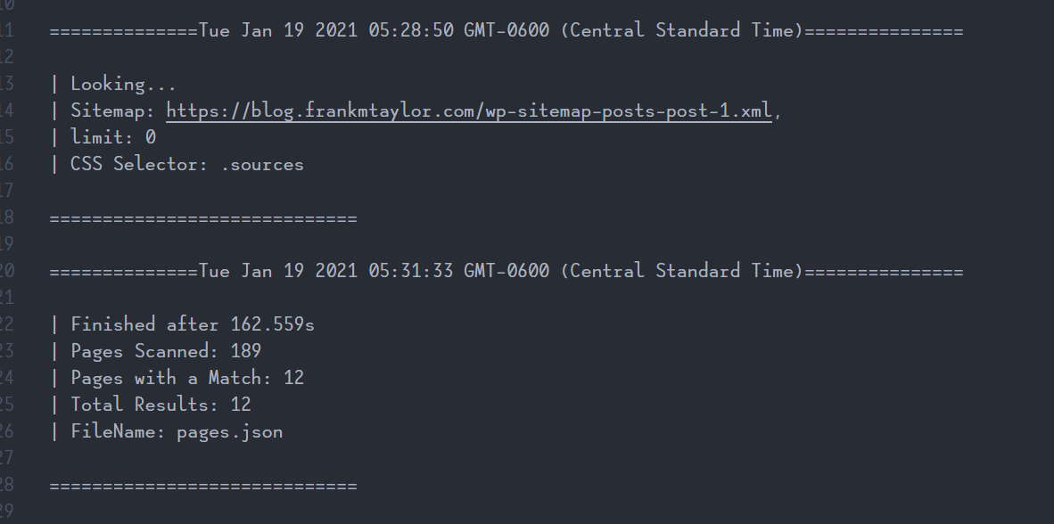 node index.js -u "https://blog.frankmtaylor.com/wp-sitemap-posts-post-1.xml" -s ".sources"
