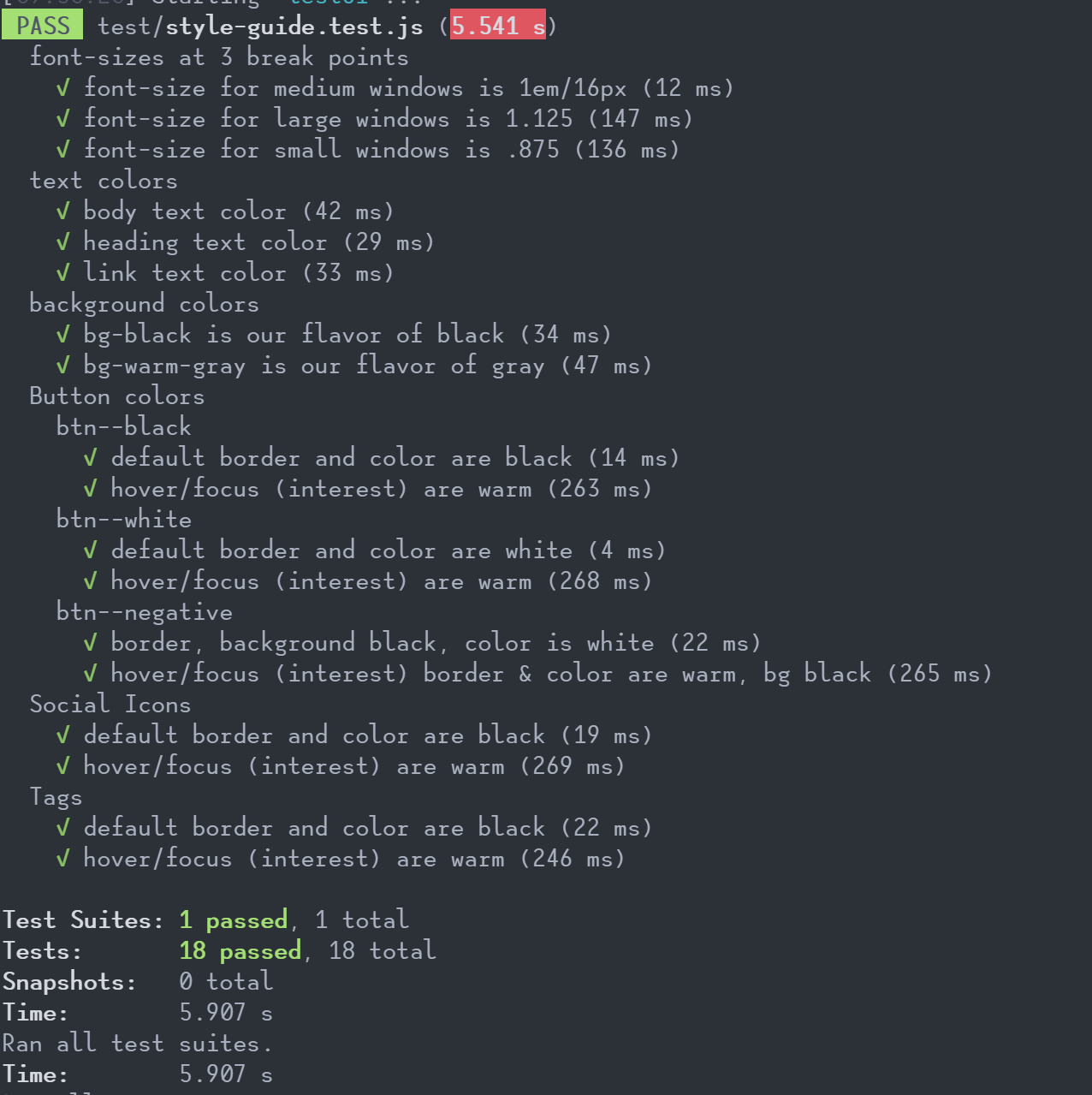 In our project, we ended up with 18 tests total to account for font size, background colors, and that our buttons and icons looked the way we wanted. We certainly could’ve expanded this to test every single part of our style-guide page. But this was enough to make sure that button colors and states weren’t going to change in the future without us catching it.